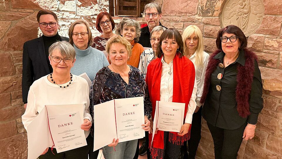 Beim Dank-Essen im Gasthaus Engel in Bühl-Vimbuch zeichneten Rotkreuz-Vorstand Kai Jehle-Mungenast und Fundus-Koordinatorin Doris Schmith-Velten zahlreiche Mitarbeitende mit einer Dankurkunde des Kreisverbands aus. Seit fünf Jahren unterstützen Gerhilde Haungs, Thomas Kamm, Edith Kienzle, Cornelia Müller, Ursula Nissen, Magdalena Schenn, Saure Vanda und Heidi Winkler das Team. Bereits seit zehn Jahren engagieren sich Christiane Müller-Richter und Monika Plachner für den DRK-Laden.