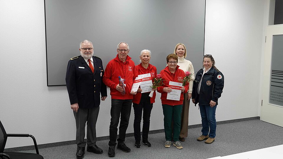 Nach dem Jahresrückblick nahmen Frau Vogler und Frau Steinebrunner die Ehrungen vor. Geehrt wurde Lucia Böhme für 10 Jahre, Harald Kühn und Dr. Katharina Buchholz-Kühn für jeweils 5 Jahre ehrenamtliche Tätigkeit beim DRK.